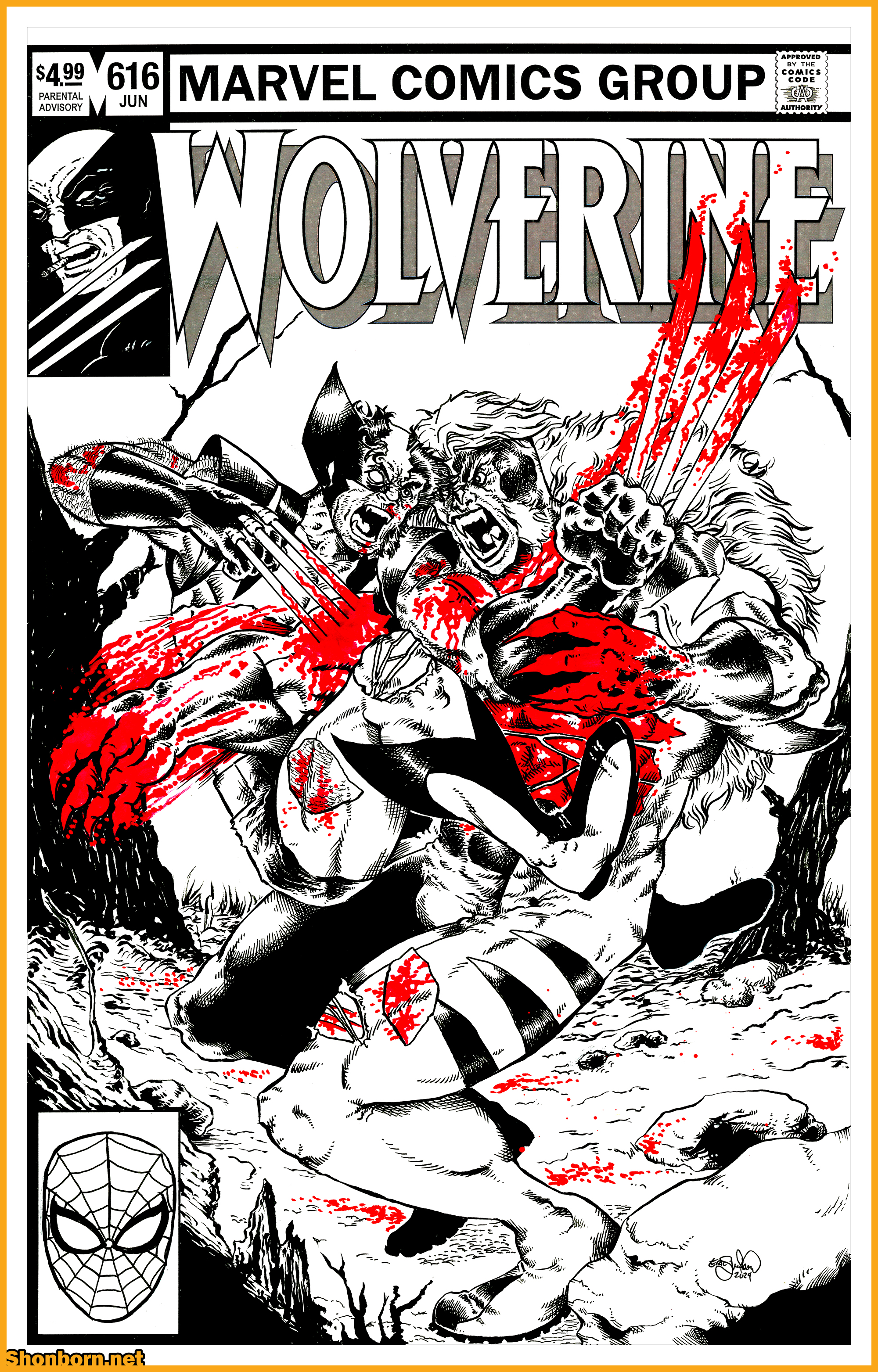 Both Spider-Man and Wolvie corner box are hand-drawn in ink. Bulk of the cover drawn in ink with white acrylic paint pen to fix mistakes and add highlights/details, and mask a few other things. The blood (because you can’t have Wolverine vs. Sabretooth without blood) was done with a combo of marker and red acrylic paint pen.