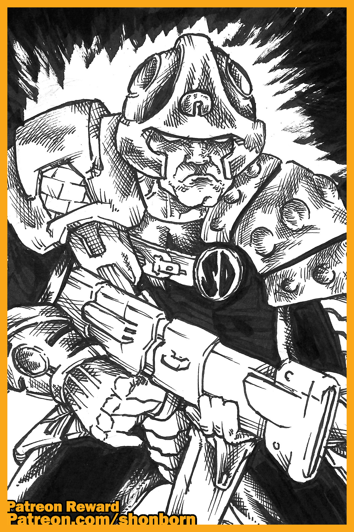 I don’t know anything about Strontium Dog, other than he looks cool and is a mainstay/visible icon of 2000 A.D. Fun to draw!