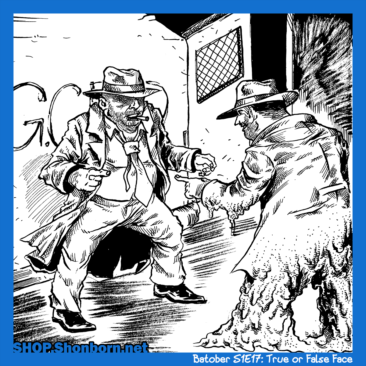 Here’s the deal: False Face is a one-shot villain. While there are comic versions of him, eh. Who cares? He’s a master of disguise. You know who else is? And has “Face” in his name? Clayface! So I drew Clayface. Now, in the ep, False Face disguises himself as Chief O’Hara. There’s no Chief O’Hara in the comics, but there is a lovably gruff right-hand man to Commissioner Gordon named Harvey Bullock, who is also fun to draw! So, Harvey Bullock meets his double!